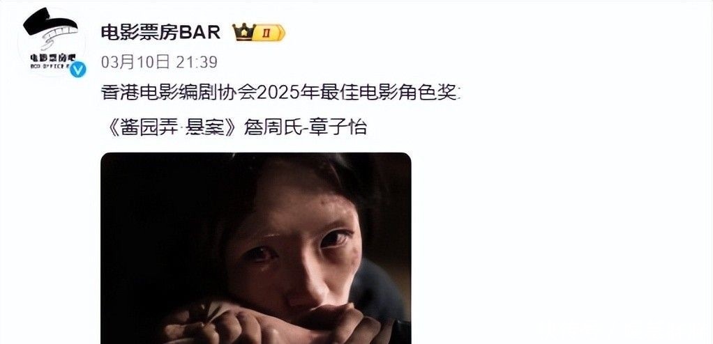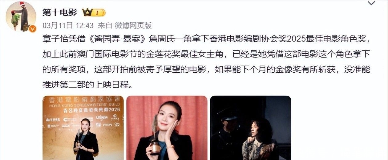 她恰是章子怡。2026年3月10日,在香港电影编剧家协会年度盛典上,她凭借电影《酱园弄・悬案》中颠簸东说念主心的詹周氏一角,荣膺“2025年度最好电影扮装”盛誉。