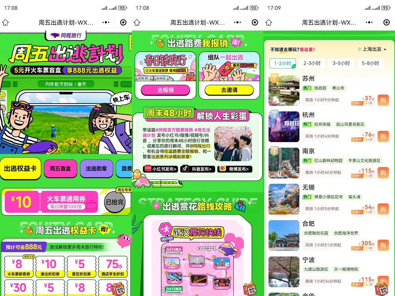 即日起,用户在同程旅行APP或小时局搜索“周五出逃”要道词,免费领取周五出逃职权卡后,即可取得相应优惠职权。主要职权包括大额火车票优惠券、景区扣头券、栈房扣头券,迁徙流量券、电影券、外卖券等,可阴事用户旅行技艺的各样化需求。此外,用户参与共享旅行攻略举止还有契机取得往复路费全额报销。